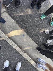 地図記号や建物の形を確認しながら歩いて、地理院地図に示される基準点を探しました。生徒たちは埋め立て地と自然の地形との境界線や標高の違いや段差を読み取り、学びを深めました。