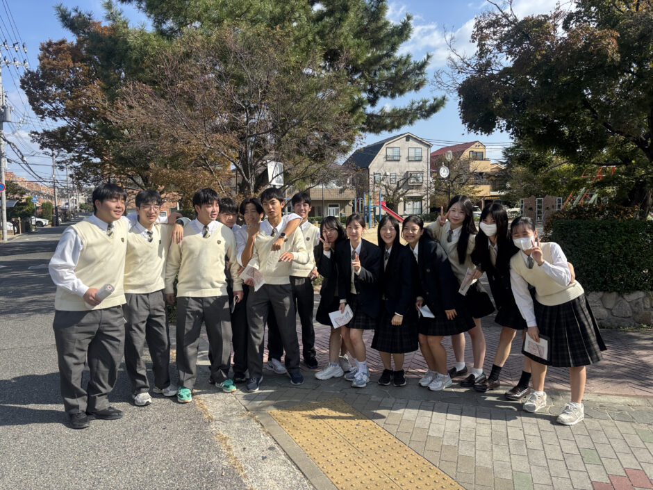 地理総合の授業でGIS(Geographic Information System)に関わるフィールドワークを行いました。フィールドワークでは、生徒たちが国土地理院の地形図と過去の衛星写真を活用して、土地利用の変化を読み取り、大東町の公園付近にある小さな基準点(500円玉大)を探しだすことができました!