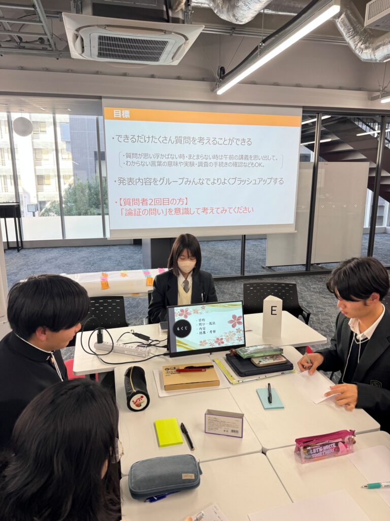 昨年度に引き続き、大阪大学豊中キャンパスにて質問力を鍛えるワークショップに参加しました。このワークショップは、本校で行っているC.C.C.(総合的な探究の時間)での活動内容を発表し、その内容について質問を受ける、また他校の発表を聞き、質問をするといった内容です。昨年度はグループでの参加でしたが、今年度は個人での参加です。1人1人が取り組んできた内容を発表していきました。1年間行ってきた探究活動について発表をし、質問を受けることで、自身の探究活動について客観的に見つめ直すきっかけになったかと思います。また、探究活動をする上で質問をする重要性を再確認することができたかと思います。このワークショップを通じて、探究活動をより深める方法を学ぶことができました。今後もこのような活動に積極的に参加し、深い学びを身につけていきましょう!