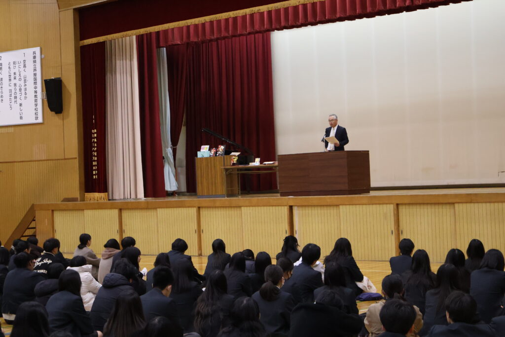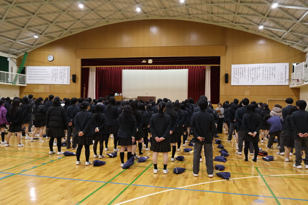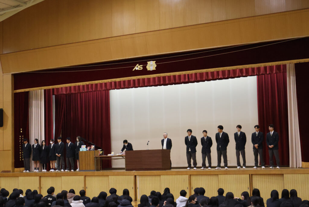 12月24日、本校体育館にて、2学期の終業式と表彰伝達式を行いました。終業式では校長先生から講話があり、今後グローバルで活躍する人には“積極性”、“主体性”、“語学”、“コミュニケーション能力”、チャレンジ精神”が大切です。ただそれより増して、「他者の違いを認め、相手を尊重し共により良い関係を築く力」が大切ですとお話しされました。なぜなら、一歩、日本の外に出て海外で活躍しようとすると、海外は日本とは文化・習慣が異なるため考え方が違う人が多くいるからです。今後、その違いを受け入れられるよう、この高校生の時期に周りにいるクラスメイトや部活仲間だけでなく、自分と趣味嗜好が異なる人とつながり、人間性を磨いて自身の引き出しのバリエーションを増やして下さいとお話しされました。