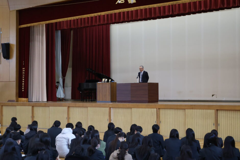 式の終了後には表彰伝達式が行われました。今回の表彰伝達式では、語学検定などで優秀な成績を収めた10名に賞状が手渡されました。日頃の学習の成果が形となり、全校生徒からも温かい拍手が送られました。また、生徒指導部長からは、日々の生活とSNSの利用について、「SNSに投稿する際、その内容が不適切でないか一度立ち止まって考えてください。他者が傷つかない内容かをしっかり確認しましょう」という大切なお話がありました。最後に、「3学期が終わった時に、この学校で良かった、このクラスで良かった」と思えるように過ごしてほしいという温かい言葉で締めくくられました。