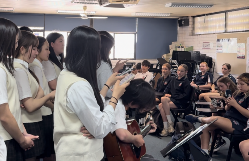 最終日に行った送別会にはバディと、お世話になった先生方を招待しました。送別会では国際生がギターの伴奏に合わせて「上を向いて歩こう/Sukiyaki」を歌い、感謝の気持ちを伝えました。